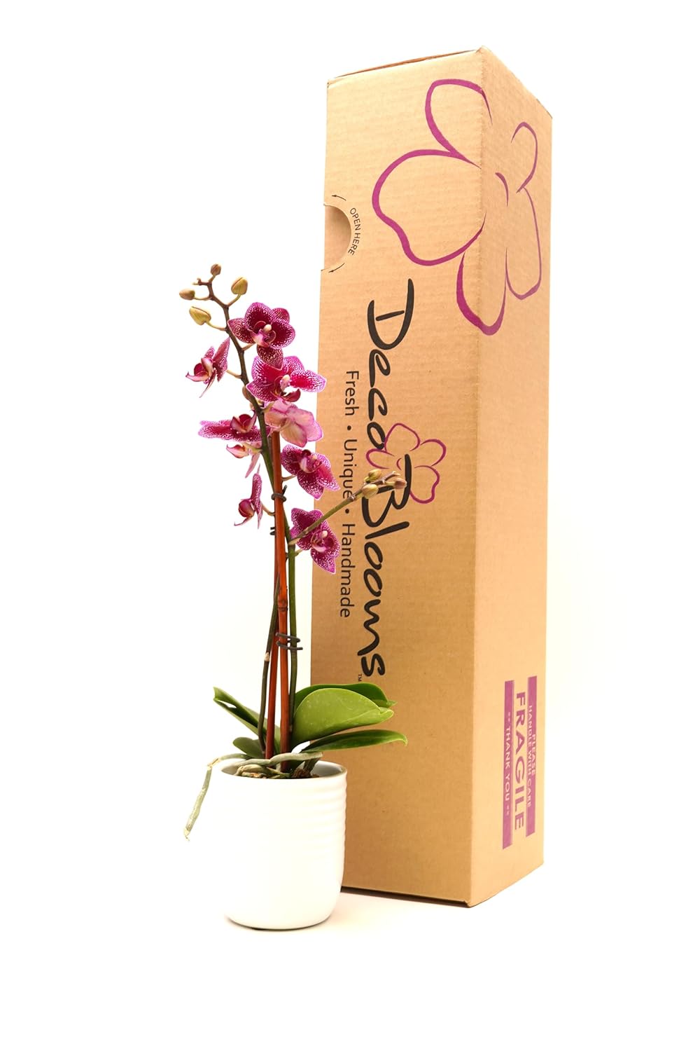 Bring a touch of sophistication to any space with the DecoBlooms Premium Orchid. Featuring delicate 3-inch blooms and lush green foliage, this exquisite live plant makes the perfect gift or home accent. Whether celebrating an anniversary, birthday, or sending a thoughtful “get well” or sympathy gift, this elegant orchid expresses grace, love, and appreciation. A beautiful way to say thank you, congratulations, or simply brighten someone’s day. Housed in a modern, stylish pot, this low-maintenance orchid enhances any room with its sophisticated charm. Ideal for living rooms, offices, bedrooms, or as a stunning centerpiece. Enjoy the beauty of fresh flowers without the hassle. Orchids require minimal care, needing only indirect light and occasional watering to thrive and bloom for weeks.